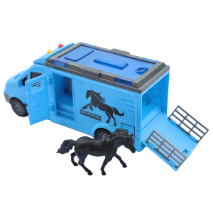 Világító és zenélő, lószállító kocsi kinyitató ajtókkal és játék lóval – 25 x 11 x 8 cm – kék (BBMJ)