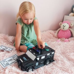 Zenélő, kódolható játék pénzszállító autó, persely – papír + érme tartó (BBJ)